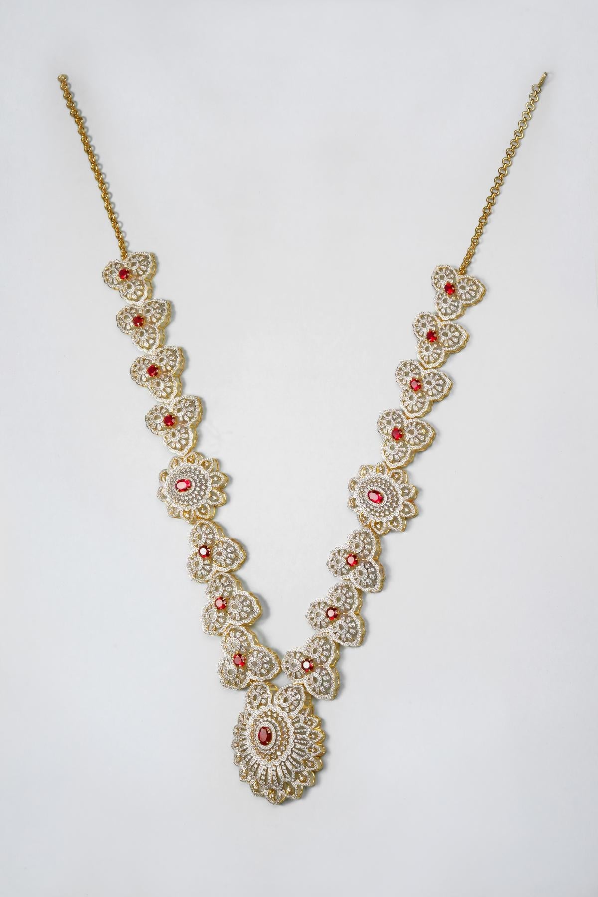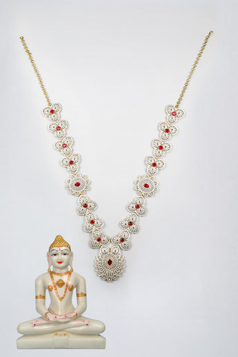 Magnify your deity's presence with this artistically crafted haar, exquisitely adorned with CZ stones and the enchanting charm of trillium shaped chains